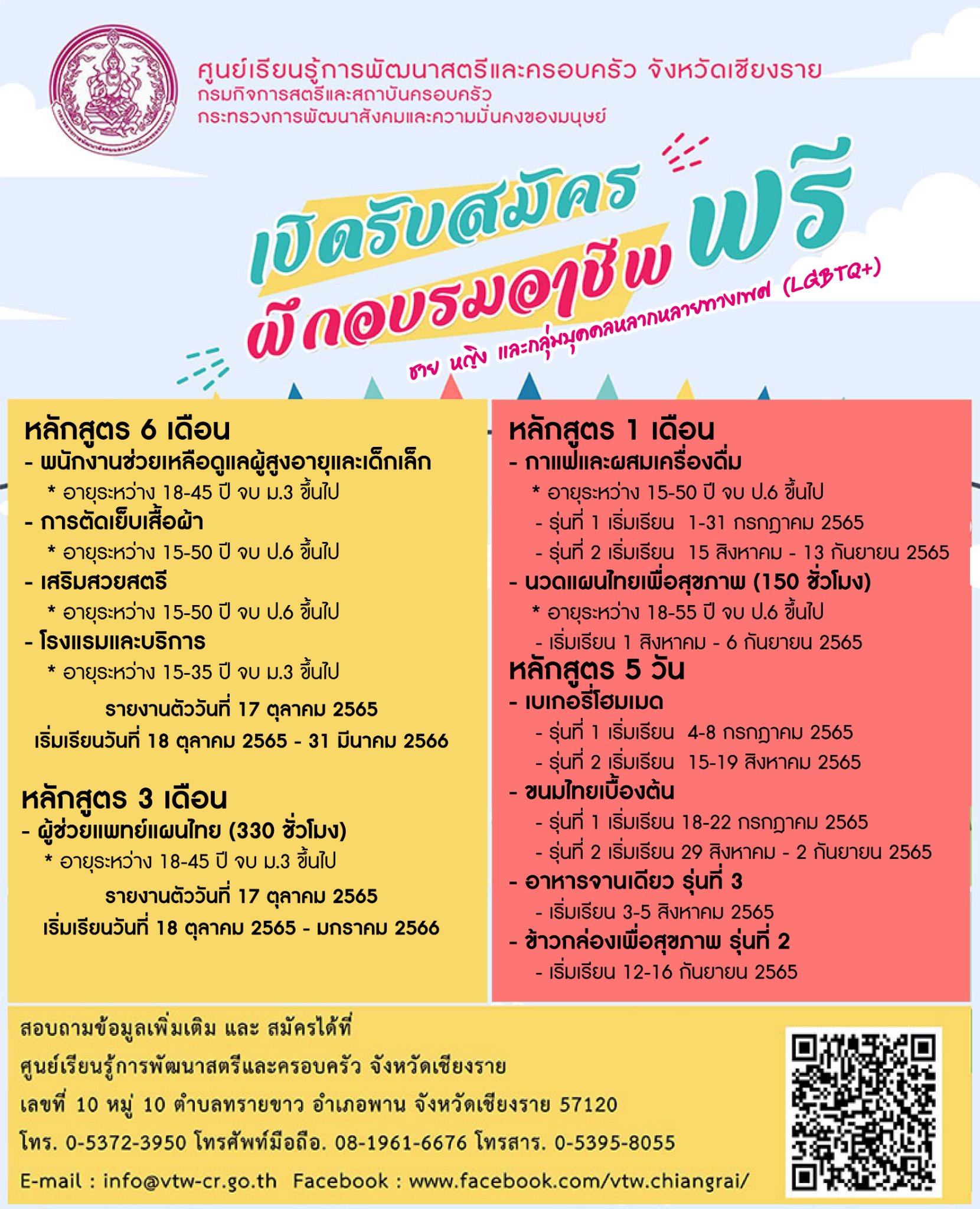รายละเอียด : ศูนย์การเรียนรู้การพัฒนาสตรีและครอบครัว จ.เชียงราย จะดำเนินการฝึกอบรมวิชาชีพหลักสูตร 6 เดือน และหลักสูตรระยะสั้นให้กับสตรี ประชาชนทั่วไป โดยไม่เสียค่าใช้จ่ายใดๆ ทั้งสิ้น โดยกำหนดเปิดรับสมัครตั้งแต่บัดนี้เป็นต้นไปจนถึงวันที่ 31 สิงหาคม 2565 (ขอสงวนสิทธิ์ไม่เปิดดำเนินการฝึกอบรมหากมีจำนวนผู้สมัครไม่ครบตามที่กำหนดไว้ในหลักสูตร) สอบถามรายละเอียดเพิ่มเติมได้ที่ โทร. 053-723950 ต่อ 19 และ 081-9616676 สมัครออนไลน์ได้ที่ http://www.vtw-cr.go.th/register.php