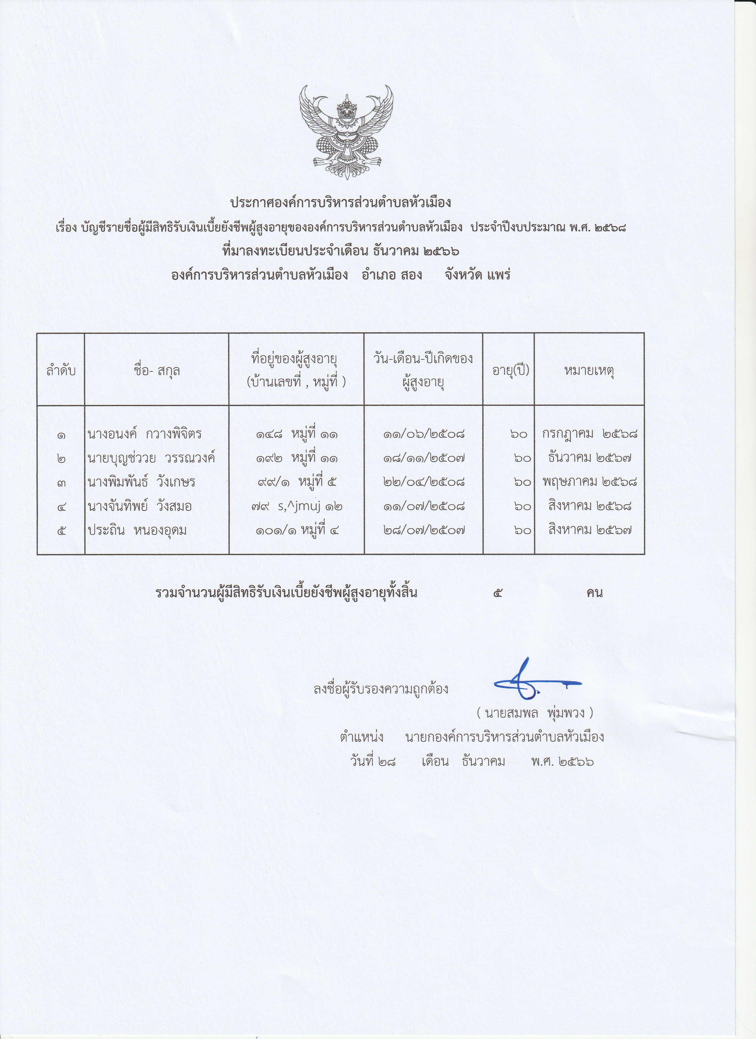 ชื่อเรื่อง : ประกาศองค์การบริหารส่วนตำบลหัวเมือง เรื่อง บัญชีรายชื่อผู้มีสิทธิรับเงินเบี้ยยังชีพผู้สูงอายุขององค์การบริหารส่วนตำบลหัวเมือง ประจำปีงบประมาณ 2568 ที่มายืนยันตัวตน ประจำเดือนธันวาคม 2566