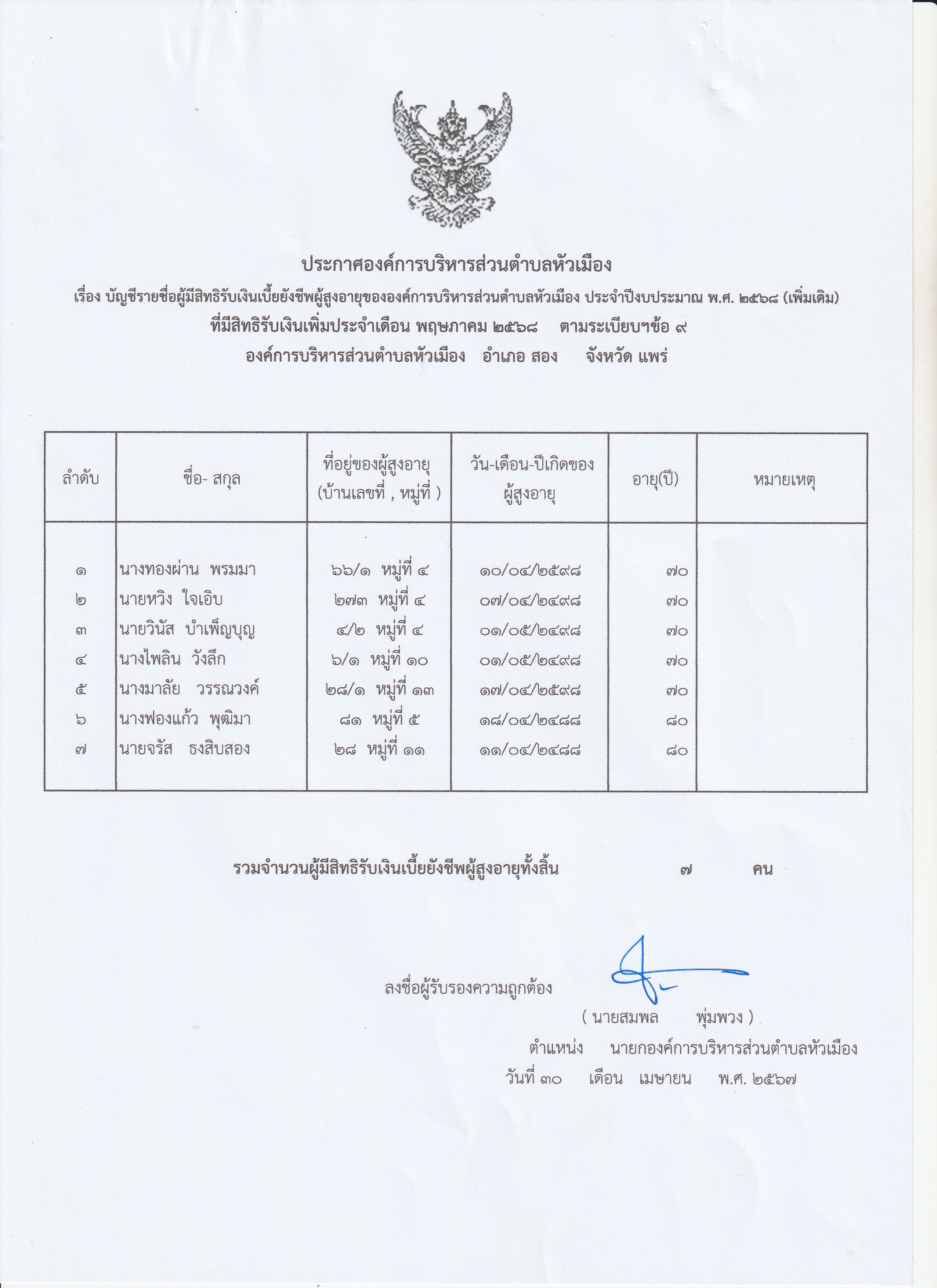 ชื่อเรื่อง : ประกาศองค์การบริหารส่วนตำบลหัวเมือง เรื่อง บัญชีรายชื่อผู้มีสิทธิรับเงินเบี้ยยังชีพผู้สูงอายุขององค์การบริหารส่วนตำบลหัวเมือง ประจำปีงบประมาณ พ.ศ. 2568 (เพิ่มเติม) ที่มีสิทธิรับเงินเพิ่มประจำเดือน พฤษภาคม 2568